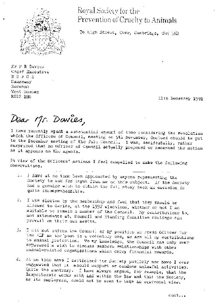 Best wishes to all for 1992. Thank you for all your help and support. We could not have survived to enter our FIFTH YEAR of publication without you. Our newsletter is produced by amateurs but we are as convinced now as we were in October 1987 that many members have suffered grave injustices that must be redressed. As Richard Adams said in 1980 - the animals are waiting looking over our shoulders to come in from torment and distress LET US ALL WORK IN HARMONY FOR THEIR RELEASE. WILL THE COUNCIL LISTEN?