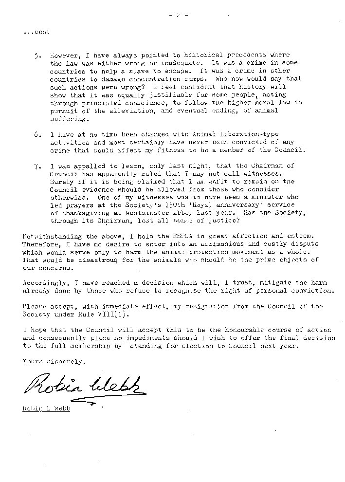 Whilst not wishing to comment at this stage about the reasons for the Council’s actions, serious criticisms must be leveled against the way in which such disciplinary procedures are conducted. For that reason we have decided to publish Robin Webb’s letter of resignation. We find it shocking that Robin Webb was not allowed to call witnesses to help him to refute the charge that he was "unfit to remain a member of the Council". On what authority did the Chairman, Mrs. Joan Felthouse make such a ruling? In Rule VIII (5) it is stated "The member shall have the opportunity of submitting ANY (our emphasis) explanation either personally or in writing to the Council."