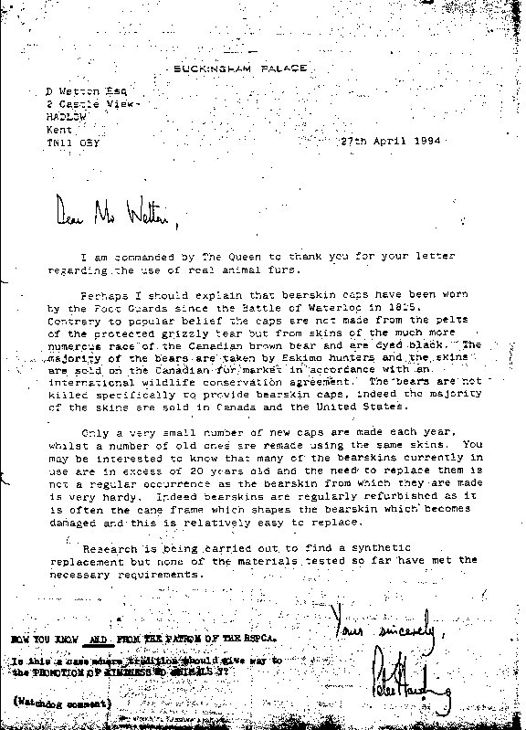 I am commanded by The Queen to thank you for your letter regarding the use of real animal furs.