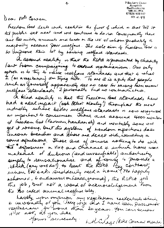 Mrs Cowan could not understand how a vegetarian could be a Director of Freedom Food Ltd. (We share her perplexity). Knowing from his CV that Mr Page was a vegetarian, she wrote to him and sent his reply to Watchdog. We have published it here.